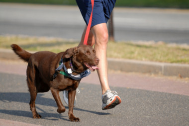 Cô ấy dắt chó đi chạy bộ .